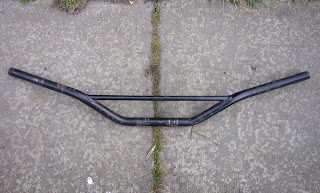 First up was to sort out the replacement handlebars. As the new bodywork I'm using is navy blue, I thought that some blue handlebars would be just the thing. A quick search located any number of ones which would have fitted the bill, but as luck would have it, before I bought any, and while looking for something else, I came across an old set of 7/8" braced 'bars in a box. Luckily they were painted rather than chromed and, although a bit pitted and scratched, they weren't actually bent. Why spend extra cash when I could, with a bit of work, refurbish something I already had?